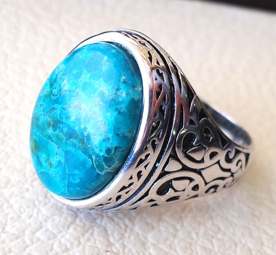 Homme Bague Chryscolla Pierre Naturelle Argent 925 Cabochon Ovale Semi Precieux Bleu Gemme En Arabe Style Ottoman Toutes Tailles Bijoux