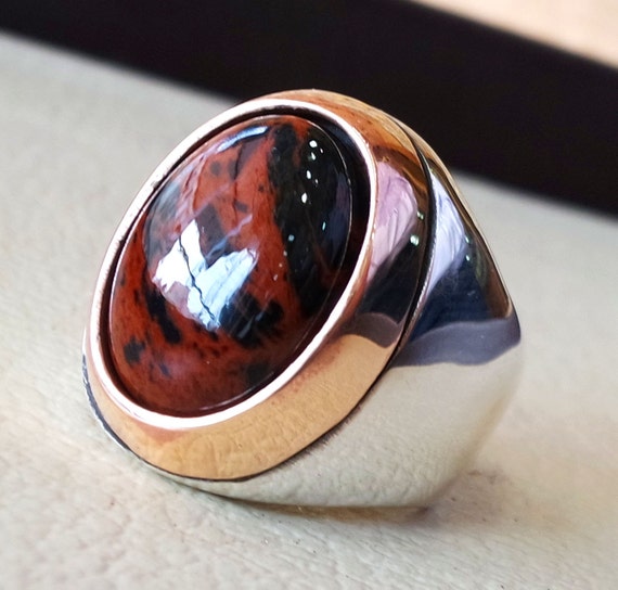 Acajou Obsidienne Homme Bague Pierre Naturelle Bijou Bague En Argent Sterling 925 Brun Et Noir Bijoux Precieux Cabochon Ovale Semi Avec Cadre En