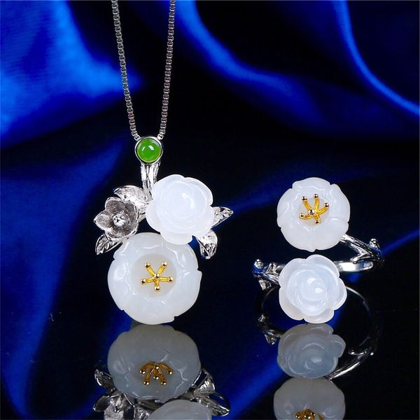 Acheter Vintage 925 Argent Blanc Hetian Jade Prune Fleur Collier Pendentif Boucles D Oreilles Bague Ensemble De Bijoux De 75 13 Du Newstarjewelry