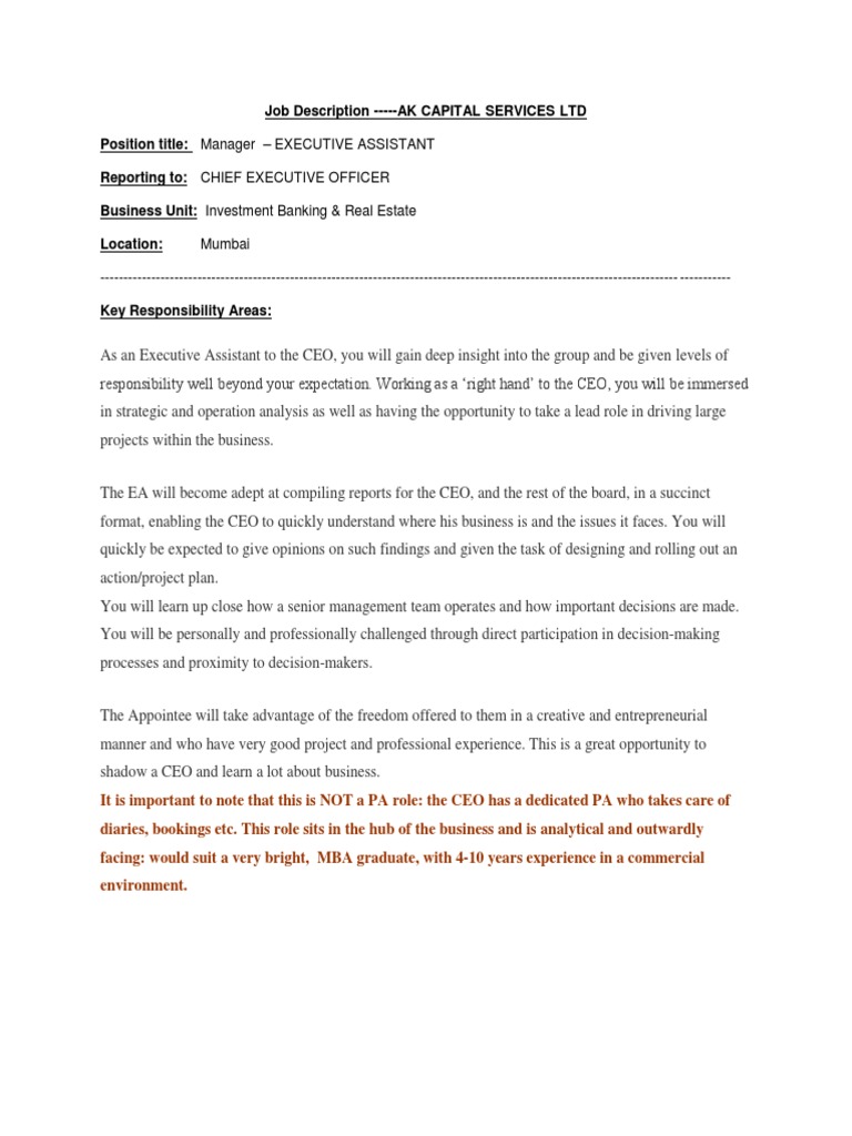 The ceo will usually have an executive assistant (ea) providing support services. Executive assistant an executive assistant is highly qualified and usually has years of experience in the administrative field. Shown below is a typical job description, highlighting the major duties, tasks, and responsibilities commonly performed by people who work as assistants to executives in most firms: The successful candidate will be committed to the mission and excited for the opportunity to leverage their organizational and interpersonal skills in support of project bread's work in a position that provides visibility into strategic and programmatic decision making. The ea takes care of administrative and other duties, freeing the ceo to focus on managing the organization. The executive assistant to the ceo is responsible for providing comprehensive support to the ceo, board of directors, and executive team and managing the organization's office operations, including working remotely with the washington state opportunity scholarship (wsos) team. This is very important role; Provide administrative and secretarial support to the ceo. Coordinated all personal and corporate. Executive assistant/office coordinator for boutique investment bank. Reporting directly to the president and ceo, the executive assistant to the president/ceo provides executive, administrative, and development support to the president and board of directors, as. Knowing that, only those with an impressive executive assistant to ceo resume will be considered for employment. Feel free to revise this job description to meet your specific job duties and job requirements.